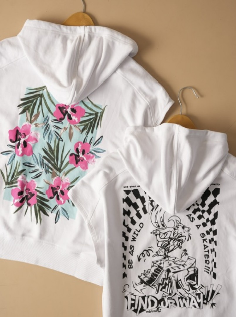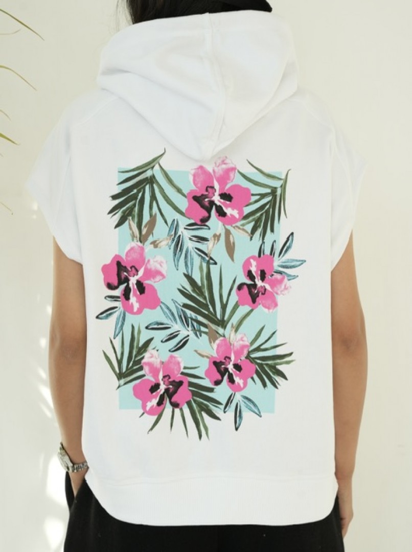 هودی سفید با چاپ فلورال ظریف در پشت لباس؛ ترکیبی ساده، خنک و چشمنواز برای استایل کژوال روزانه.