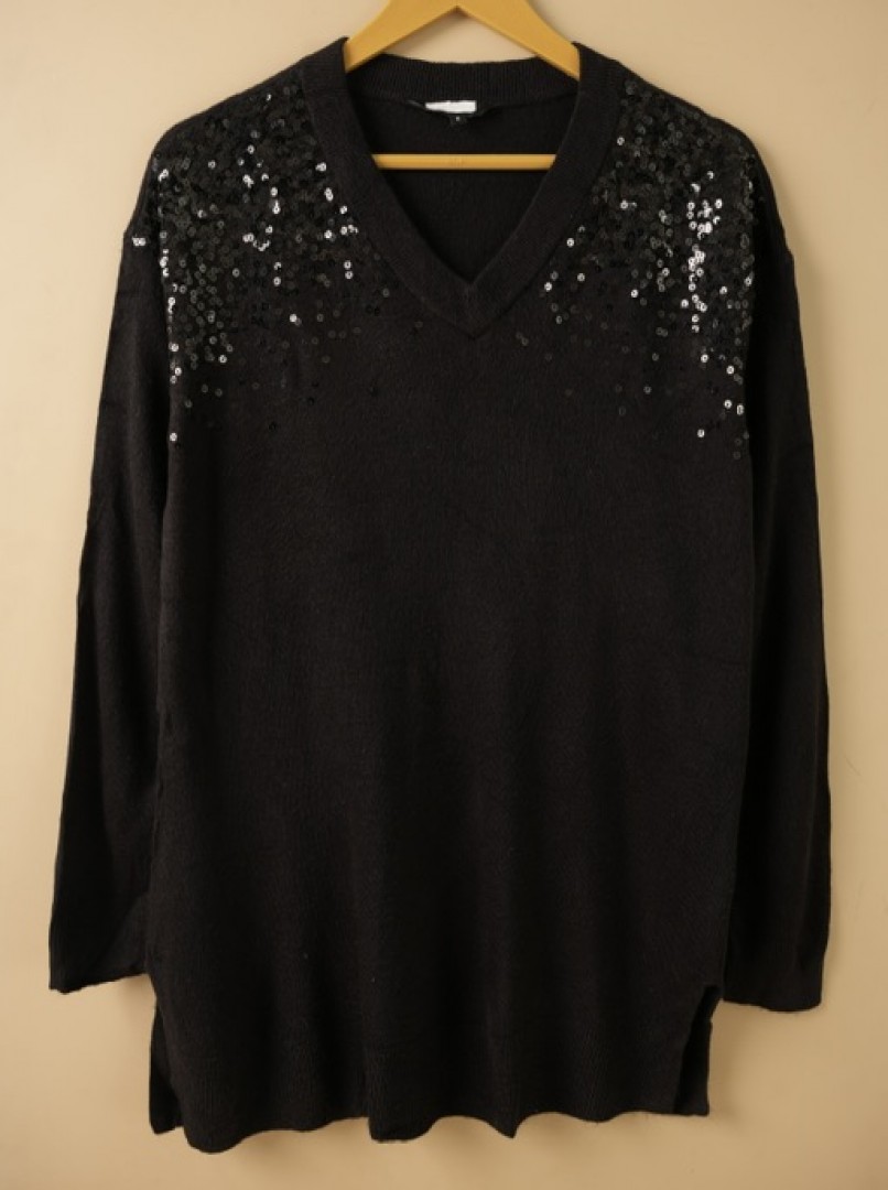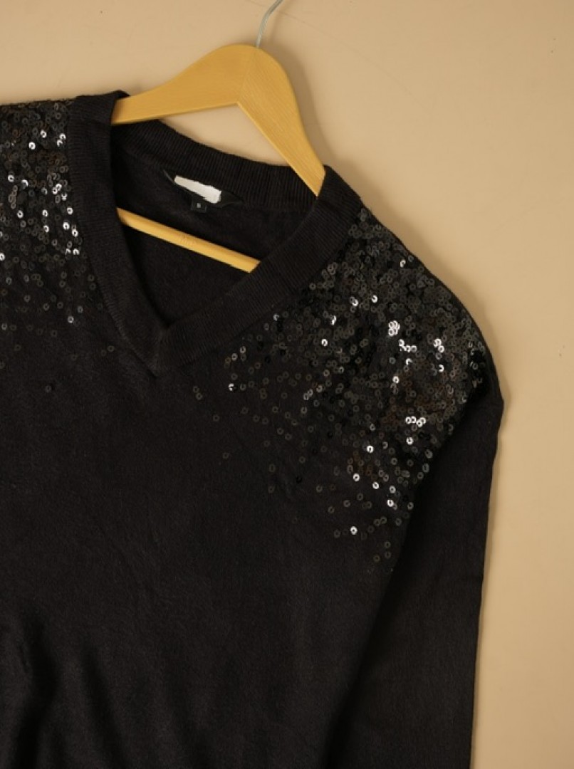 بافت لطیف و سبک مشکی سرشونه پولکی با طراحی درخشان و جذاب، انتخابی شیک برای استایل روزمره و مجلسی است؛ نرم، راحت و مناسب مهمانیها