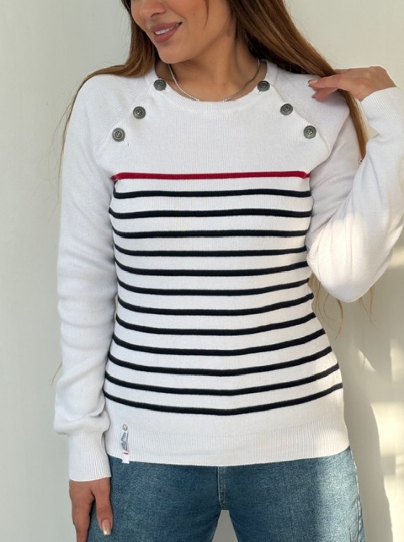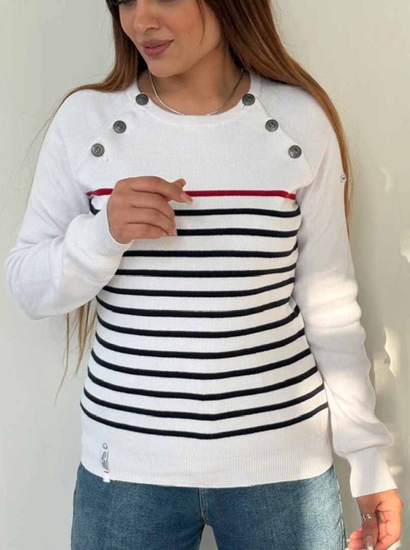 بافت راه‌راه خوشرنگ سرشانه دکمه‌دار، یک انتخاب شیک و کاربردی برای استایل روزمره و نیمه‌رسمی است. این لباس با طراحی راه‌راه جذاب، رنگ‌بندی چشم‌نواز و دکمه‌های ظریف روی سرشانه، ظاهری خاص و مدرن ایجاد می‌کند. استفاده از بافت باکیفیت، تن‌خور راحت و دوام بالا، آن را مناسب فصل‌های سرد سال کرده و به‌راحتی با شلوار جین یا پارچه‌ای ست می‌شود