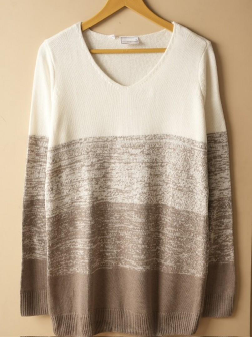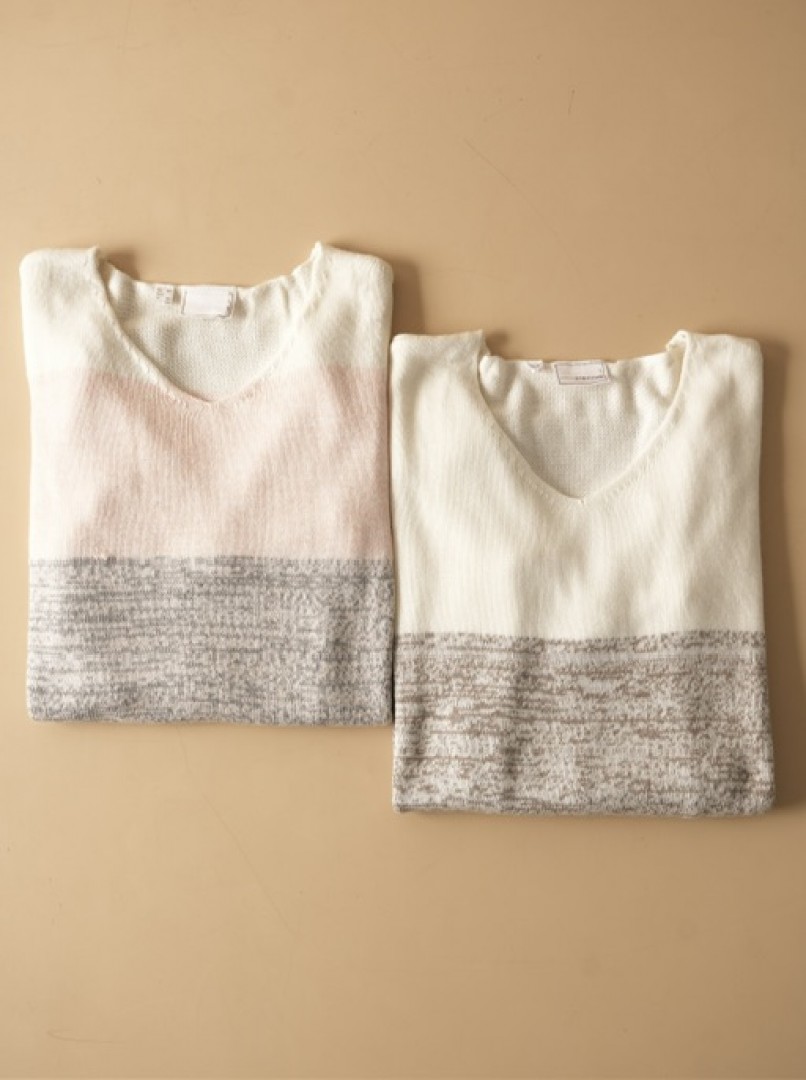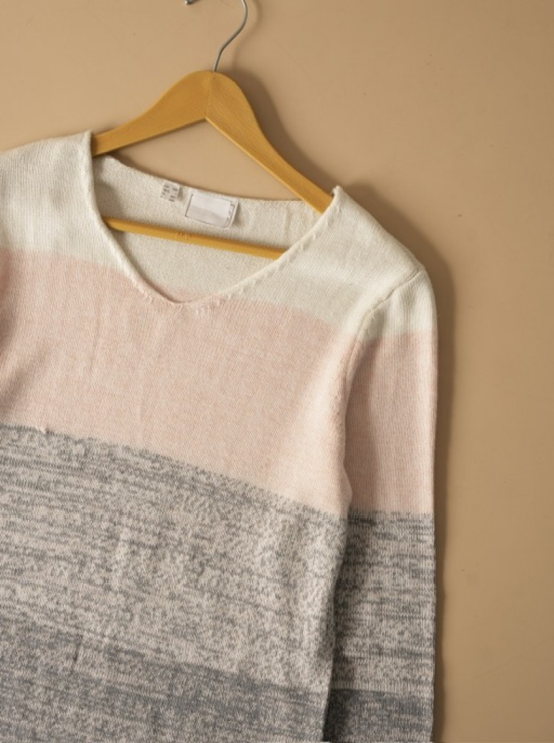 پلیور زنانه بافت راهراه طوسی و صورتی و کاراملی با یقههفت، مناسب استایل پاییزی و زمستانی