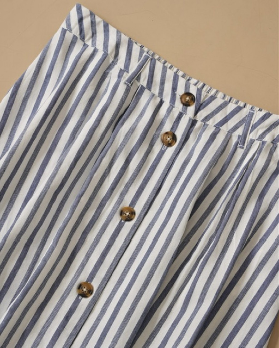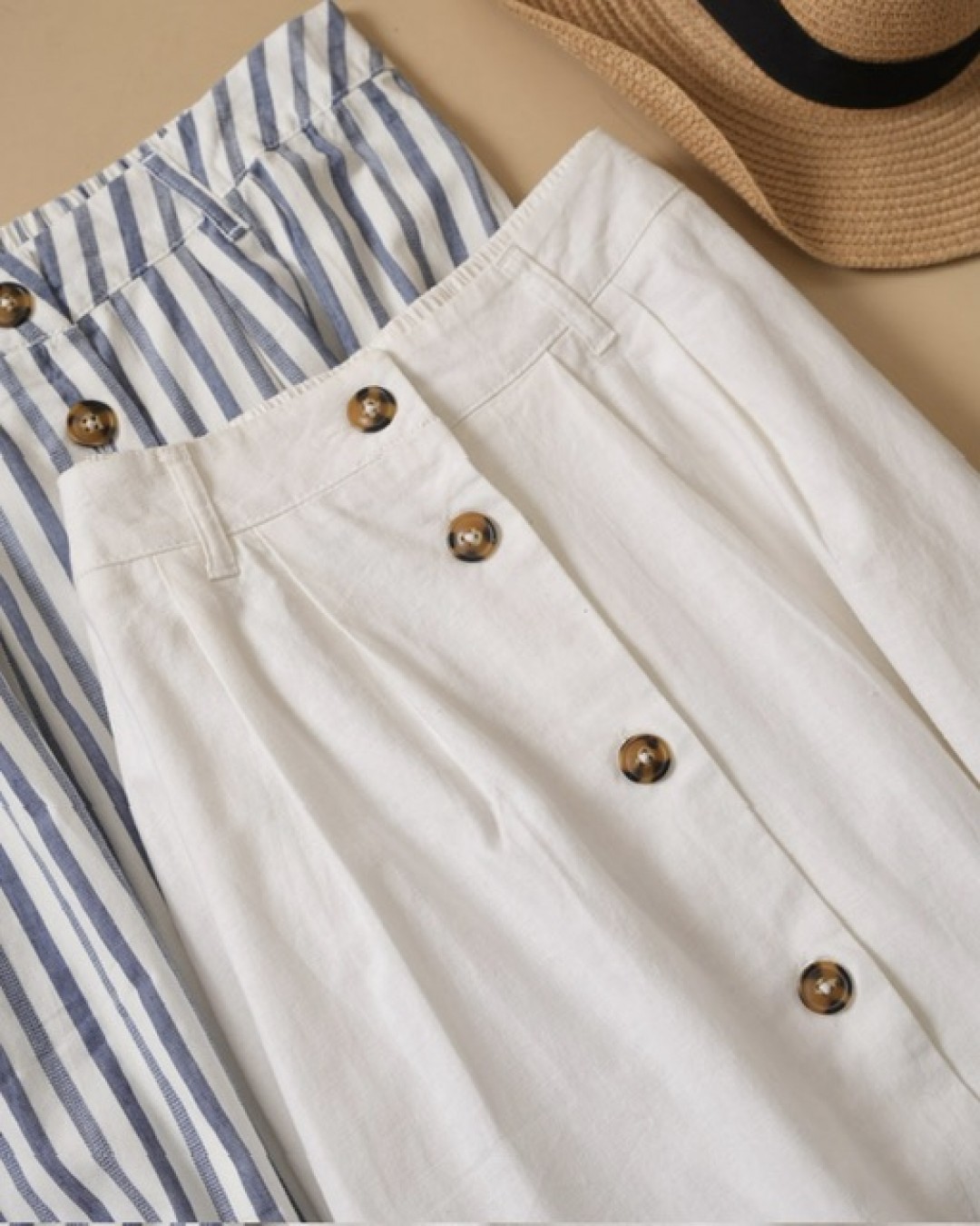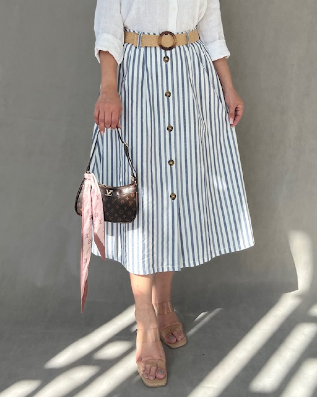 • جنس: لینن و کتان خنک و تنفسپذیر مناسب بهار و تابستان • مدل: میدی A-line دکمهدار جلو • طراحی: دکمه طرح چوب • رنگبندی: سفید ساده / راهراه آبی • استایل: مناسب کژوال، روزمره و نیمهرسمی • قابلیت ست شدن با شومیز، مانتو تابستانی و تیشرت