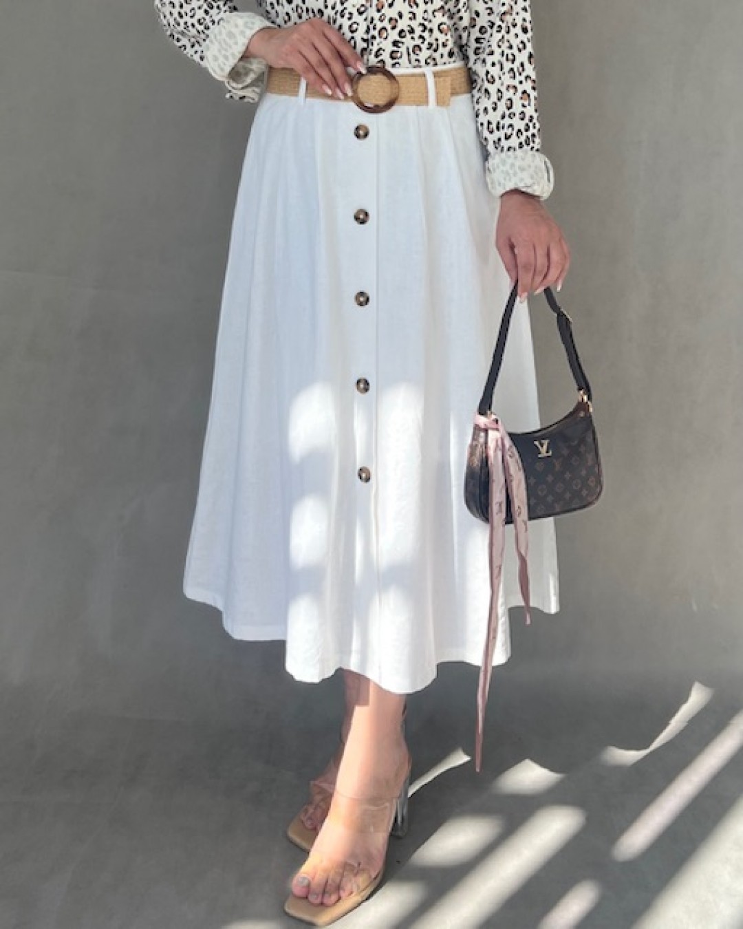 دامن لینن میدی زنانه با طراحی دکمهدار جلو و فرم A-line، انتخابی شیک و کاربردی برای استایلهای روزمره و نیمهرسمی است. این دامن از پارچه لینن خنک و تنفسپذیر تولید شده و گزینهای ایدهآل برای فصل بهار و تابستان محسوب میشود