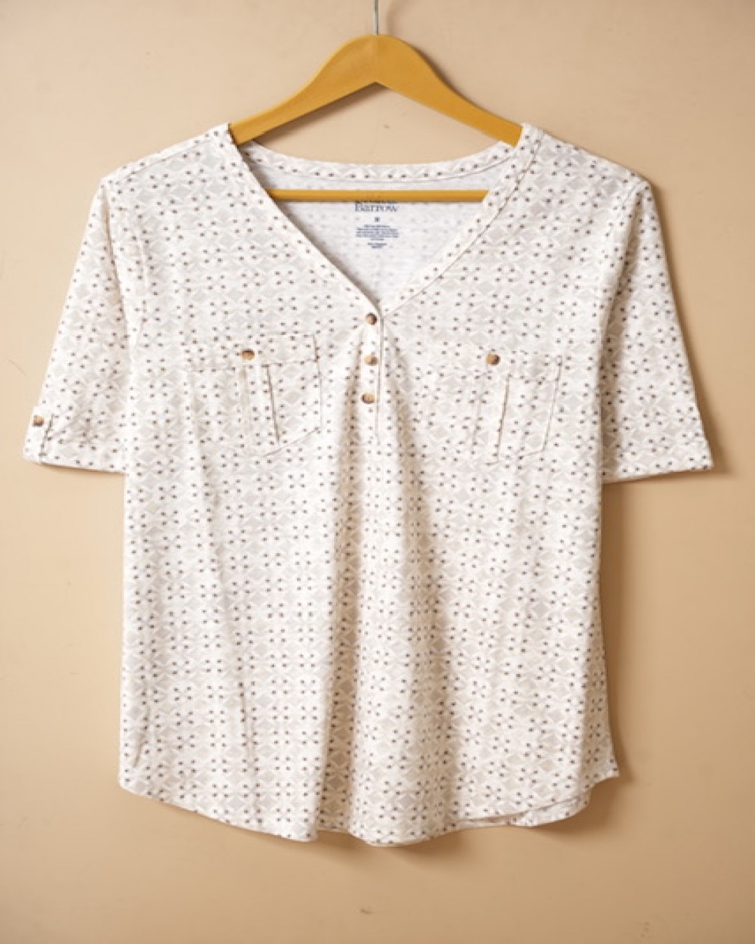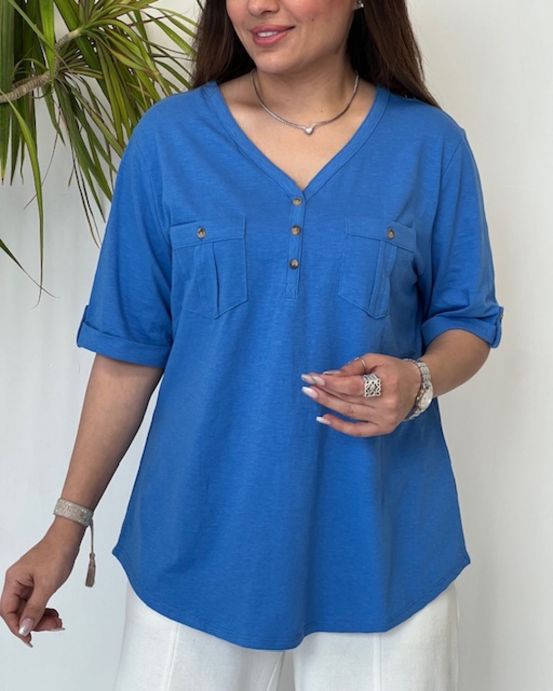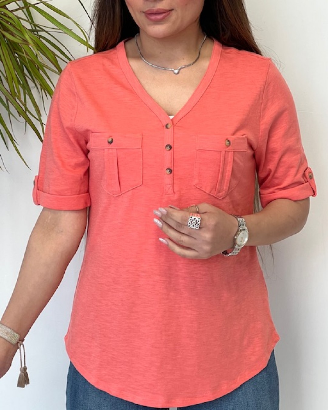 این تیشرت زنانه نخ و پنبه با طراحی شیک و مدرن، انتخابی عالی برای استایل روزمره و کژوال است. استفاده از پارچهی نخ و پنبهی باکیفیت باعث نرمی، سبکی و عبور مناسب هوا شده و احساس راحتی در طول روز را فراهم میکند. طرح و رنگ جذاب در کنار دو جیب کاربردی و سه دکمهی ظریف جلوهای خاص و متفاوت به این تیشرت زنانه بخشیده است.