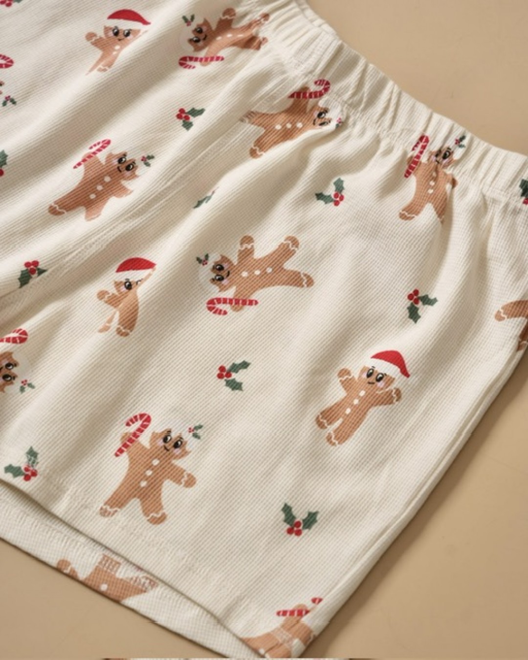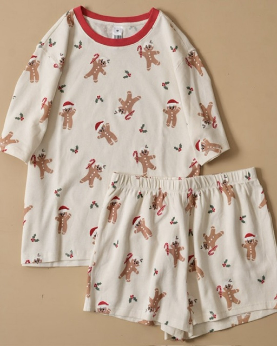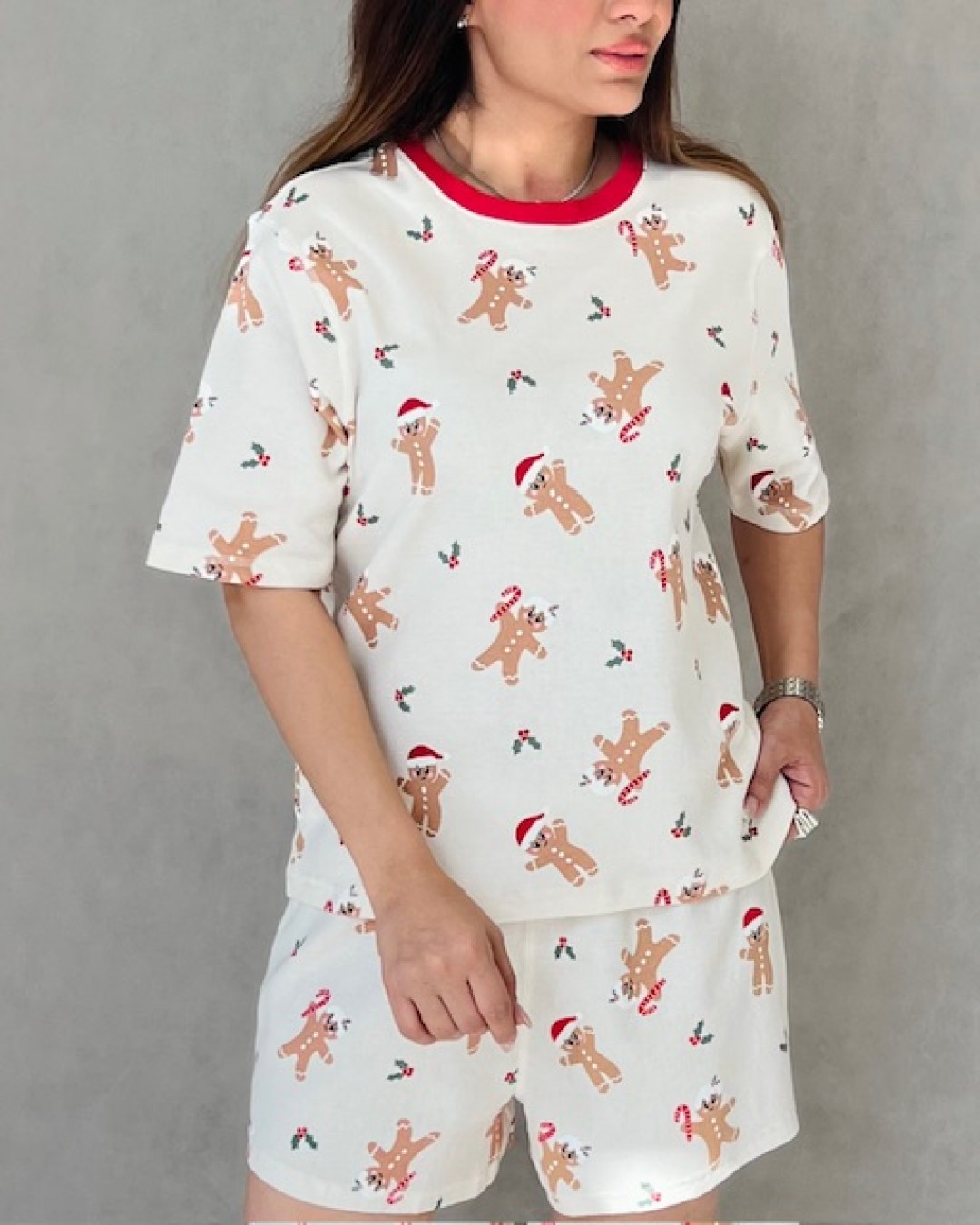 ست راحتی زنانه طرح کوکی کریسمسی، ترکیبی دلنشین از لطافت، راحتی و طراحی فانتزی است. این ست شامل تیشرت آستین کوتاه با یقه قرمز جذاب و شلوارک همرنگ بوده که با چاپ ظریف کوکیهای زنجبیلی و تم بهاری، حس گرم و شادی به استایل شما میبخشد